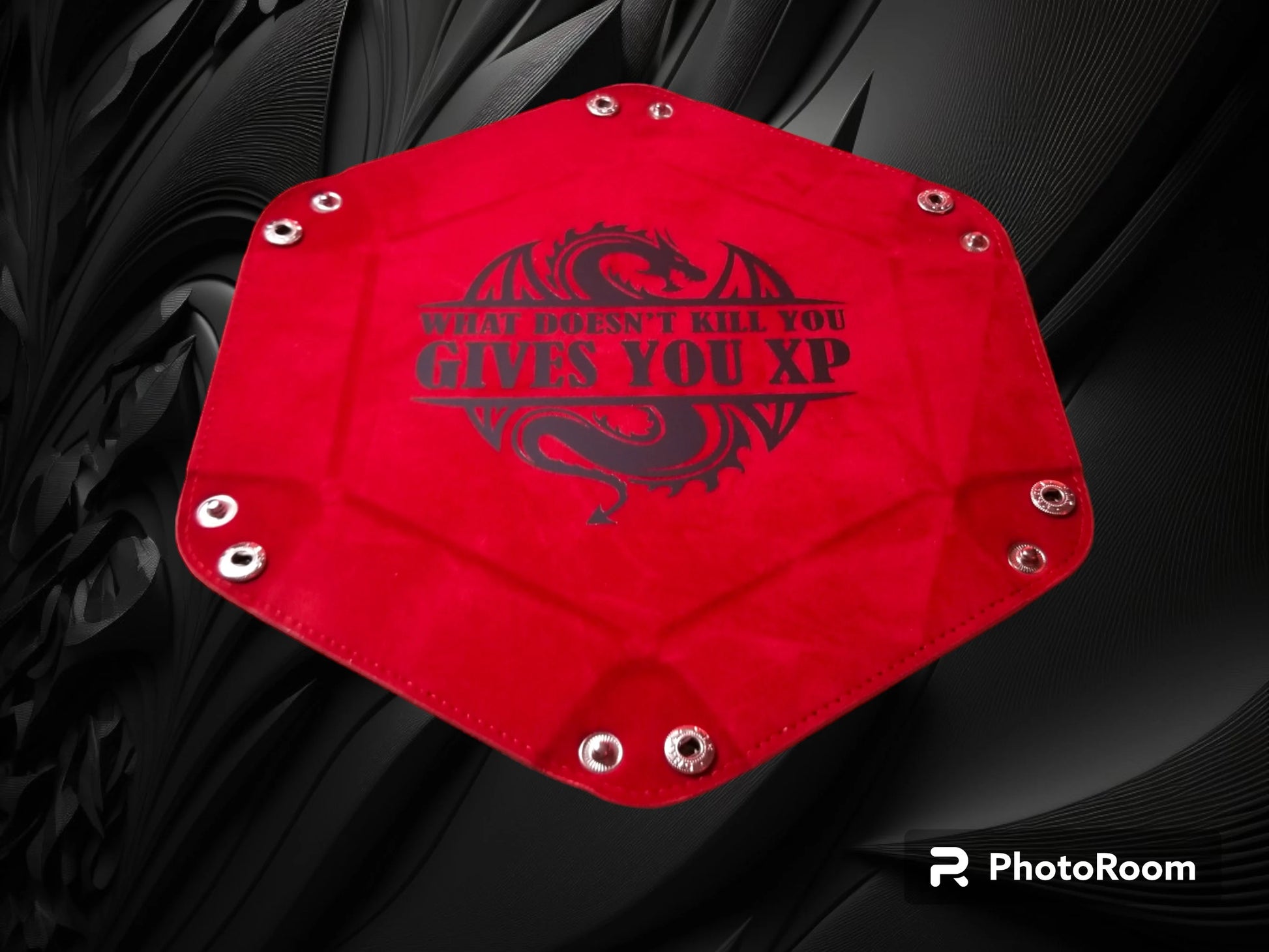 This red dice tray features a black matte dragon with a very true d&d saying fused to the fabric.